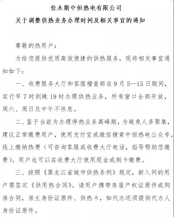 需要辦理停止供熱,恢復(fù)供熱的用戶,按照《黑龍江省城市供熱條例》規(guī)定,請(qǐng)您于2021年8月1日至2021年9月15日期間持客戶身份證原件、房屋產(chǎn)權(quán)證原件到威立雅服務(wù)廳辦理。